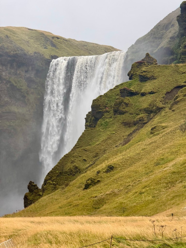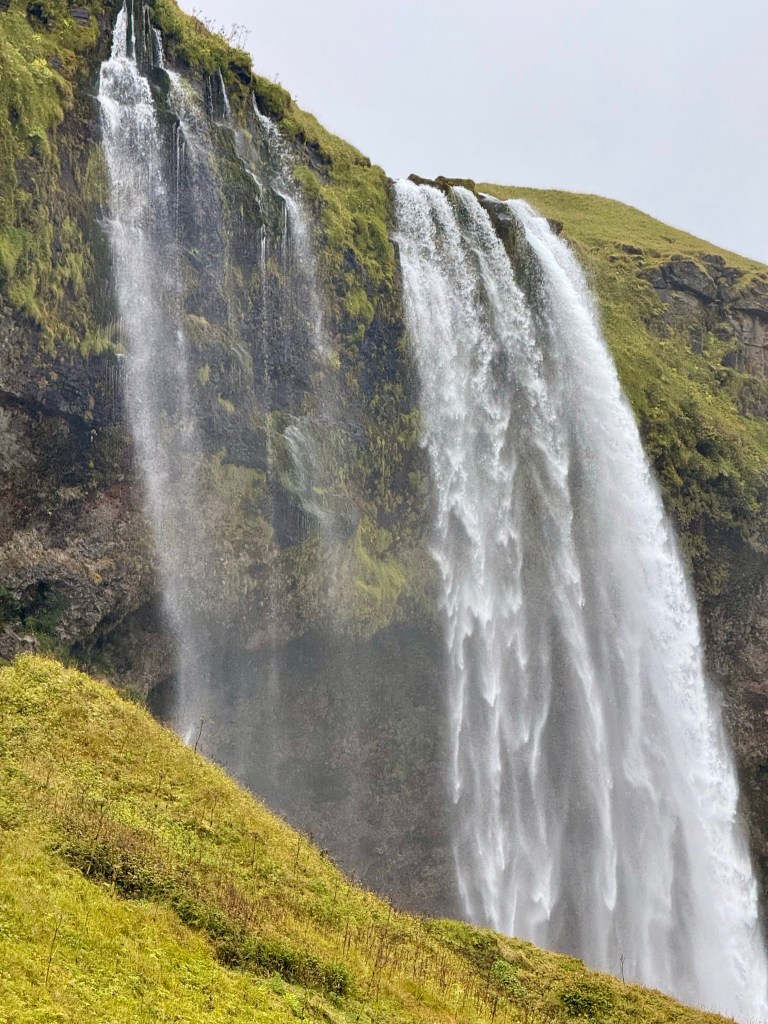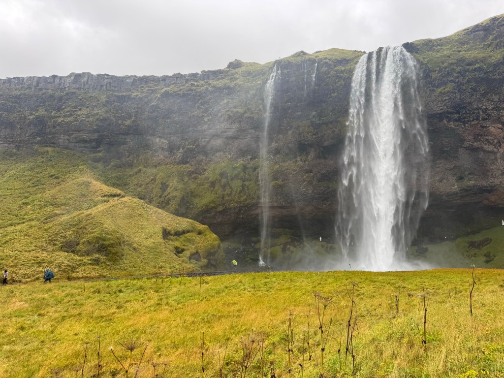 Our first stop was the Seljalandsfoss waterfall. It’s the main fall amongst a series that run down the mountain side fed by a glacial river above.