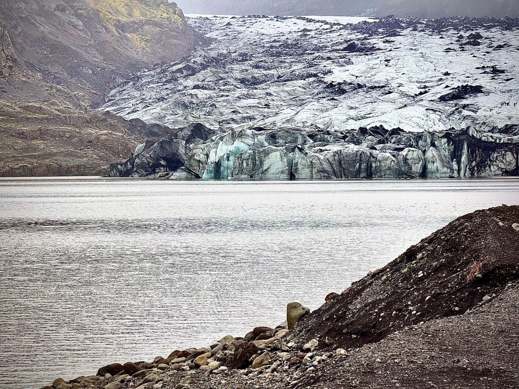 In the picture below you can see the end point of the glacier, discoloured by rocks and also volcanic ash from prior eruptions in Iceland.
