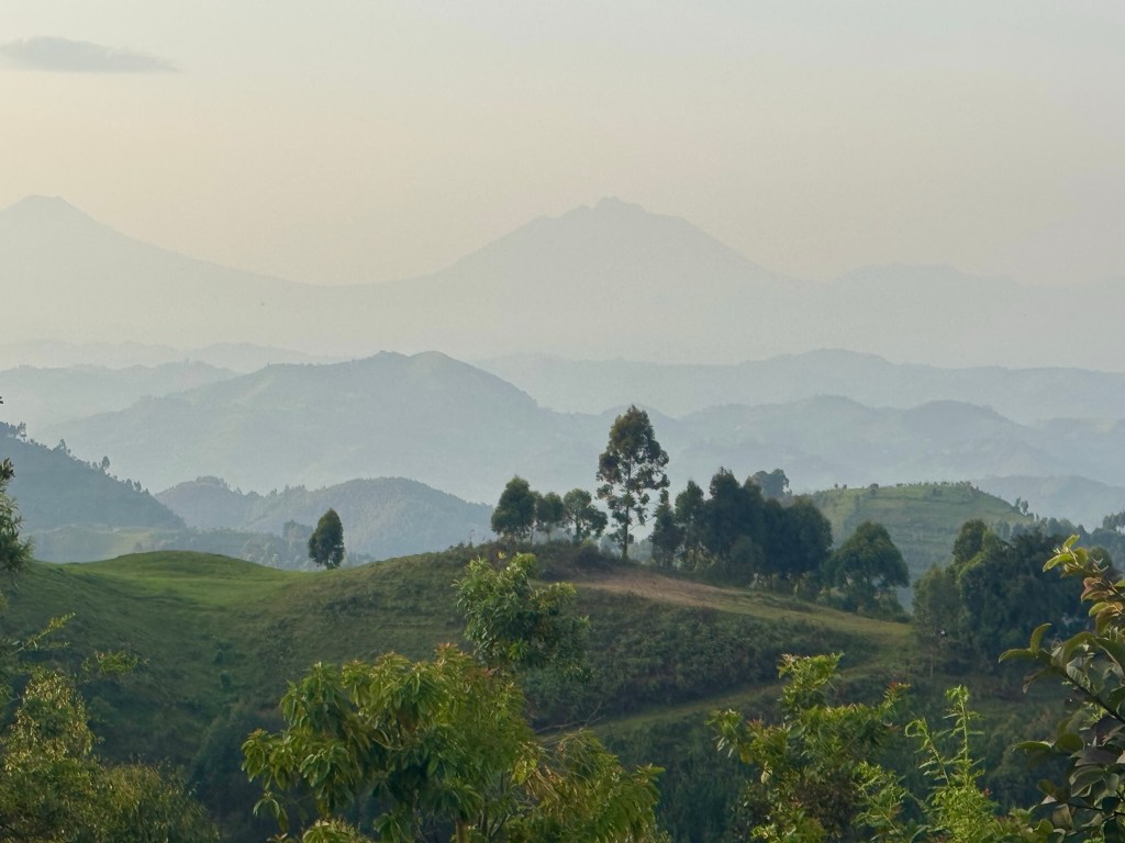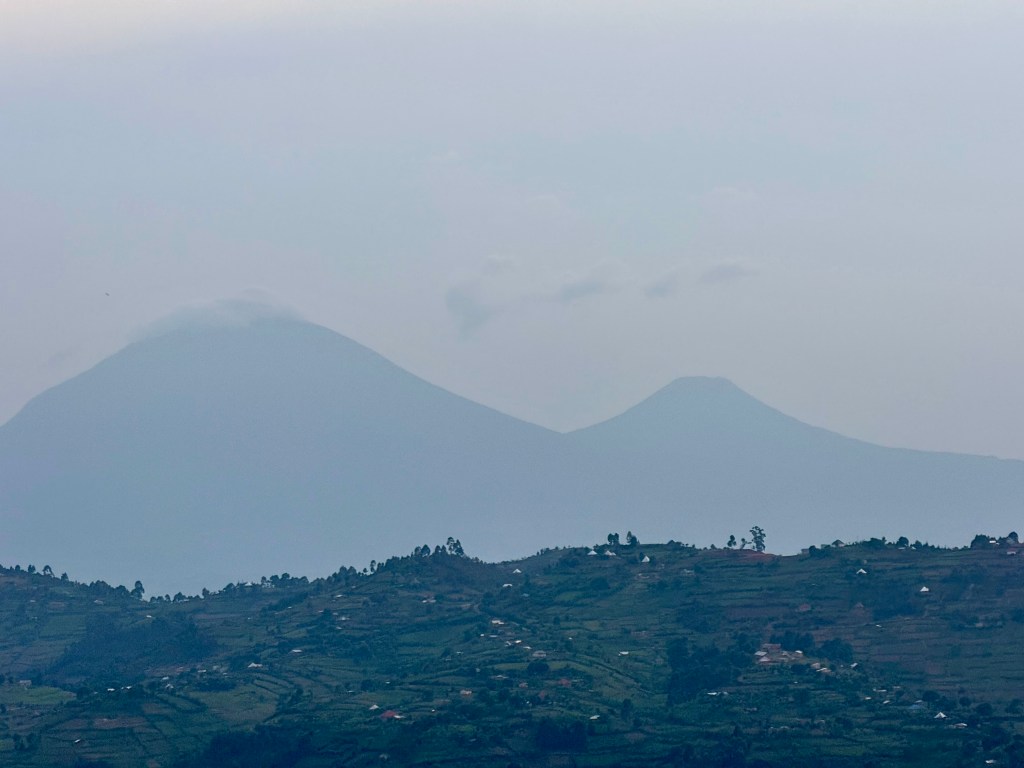 As we closed in on our destination we could just about see the distant peaks of the Virunga volcanoes.
