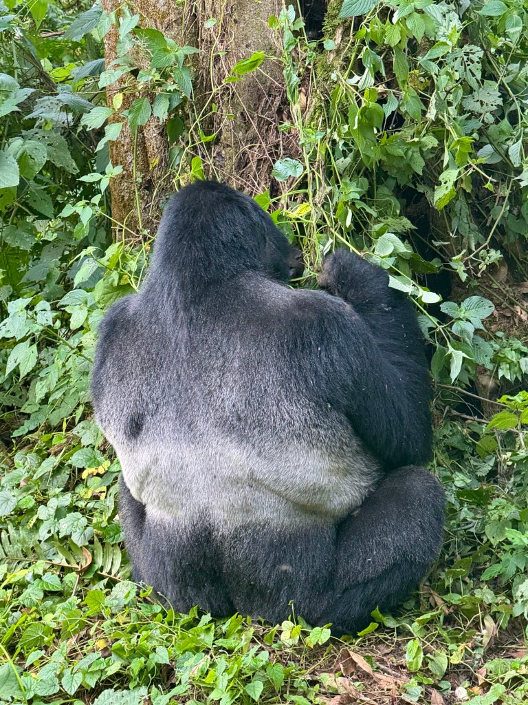 We see the Silverback facing a tree, it’s size and clear muscular strength apparent even from the rear.