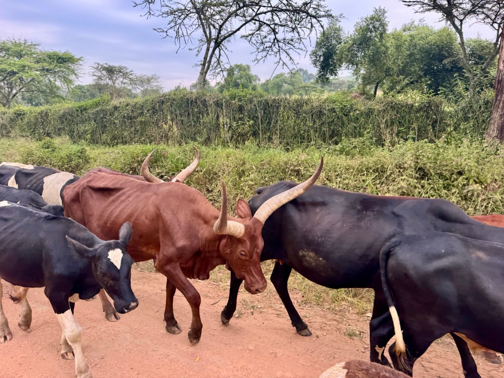We saw lots of cows with outlandishly large horns, they are Ankole Longhorns.