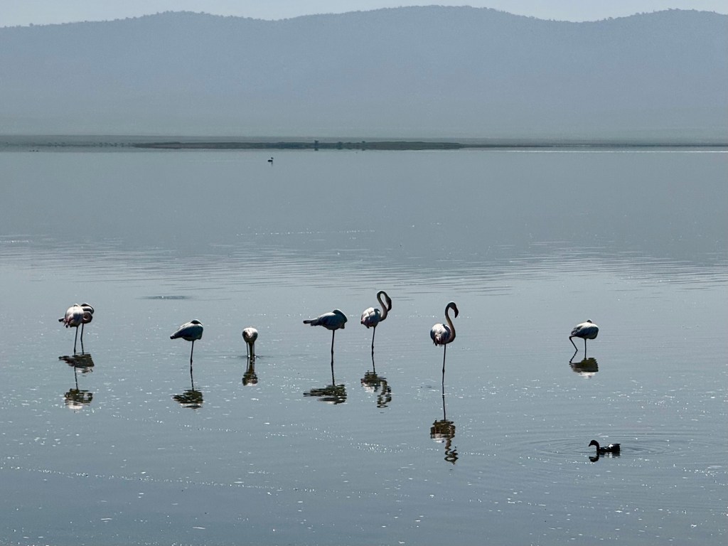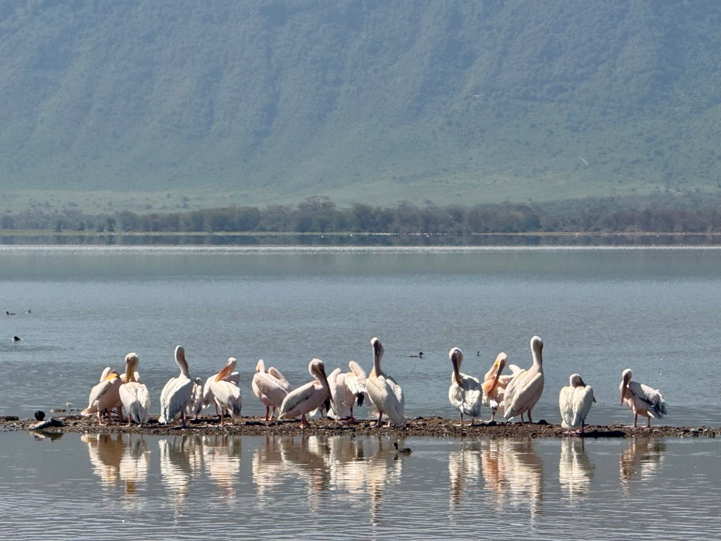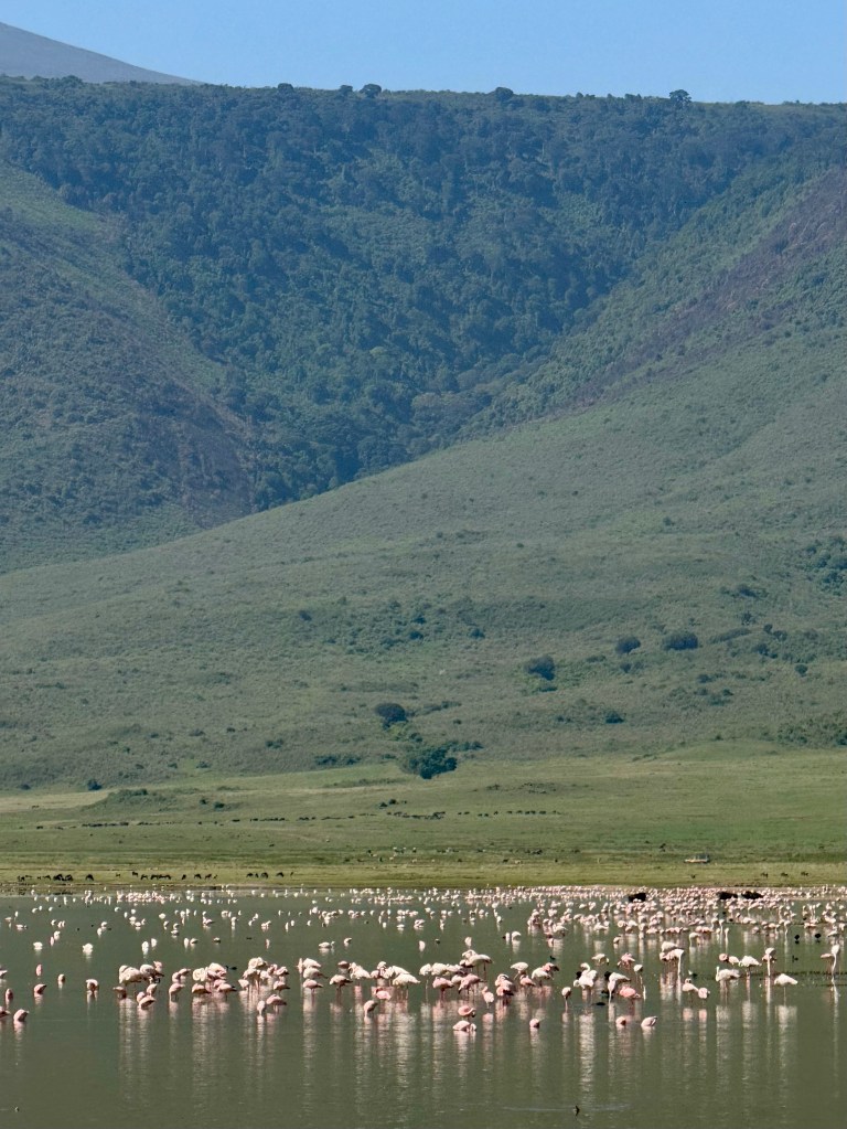 Within the crater sits lake Magadi which is home to many different species of birds, including pelicans and flamingos.