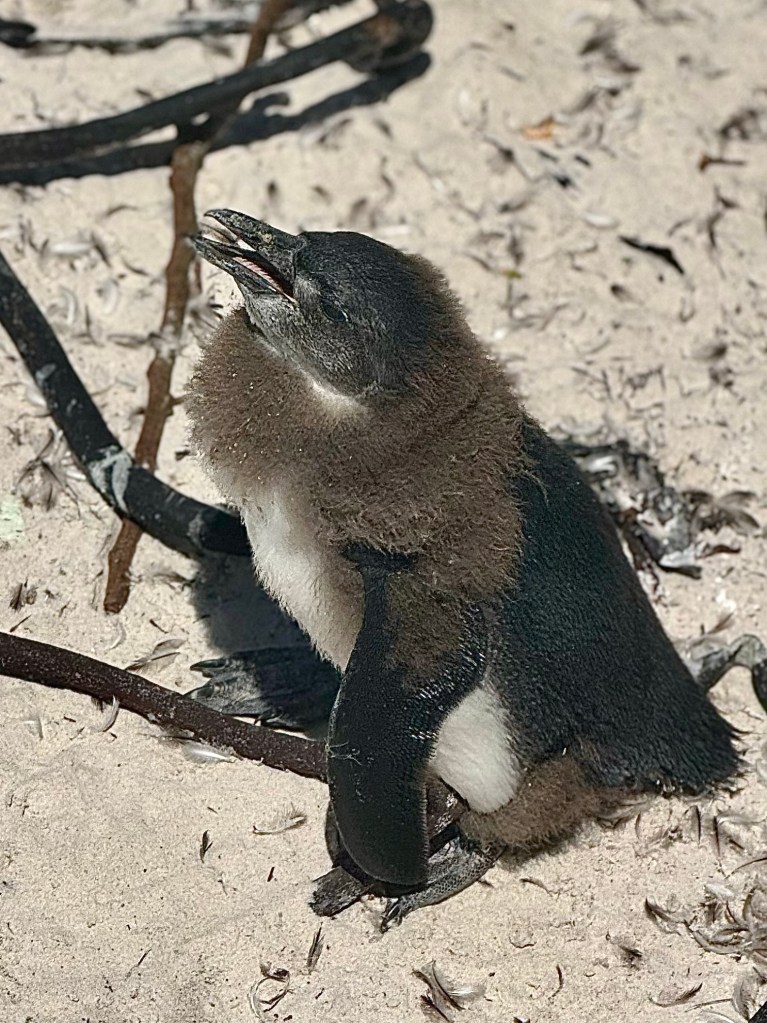 A baby penguin below with it’s fluffy down coat. It takes a couple of months for their juvenile waterproof coats to be ready for the sea.